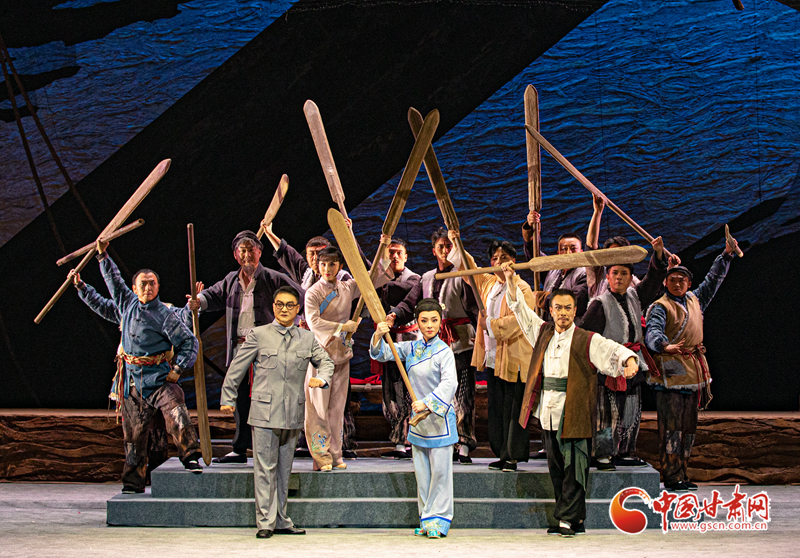 隴劇《大河?xùn)|流》于19日晚在甘肅黃河劇院成功首演。該劇以20世紀(jì)30年代末抗戰(zhàn)為背景,運(yùn)用具有地方特色的隴劇形式,生動地描繪了大西北黃河邊的一群筏客子在國家危難之際,如何放下個(gè)人恩怨,團(tuán)結(jié)起來支援抗戰(zhàn),組成水上大型運(yùn)輸隊(duì),將大量物資安全送達(dá)抗戰(zhàn)前線,創(chuàng)造了“羊皮筏子賽軍艦”的傳奇故事。(甘肅省隴劇院供圖)
