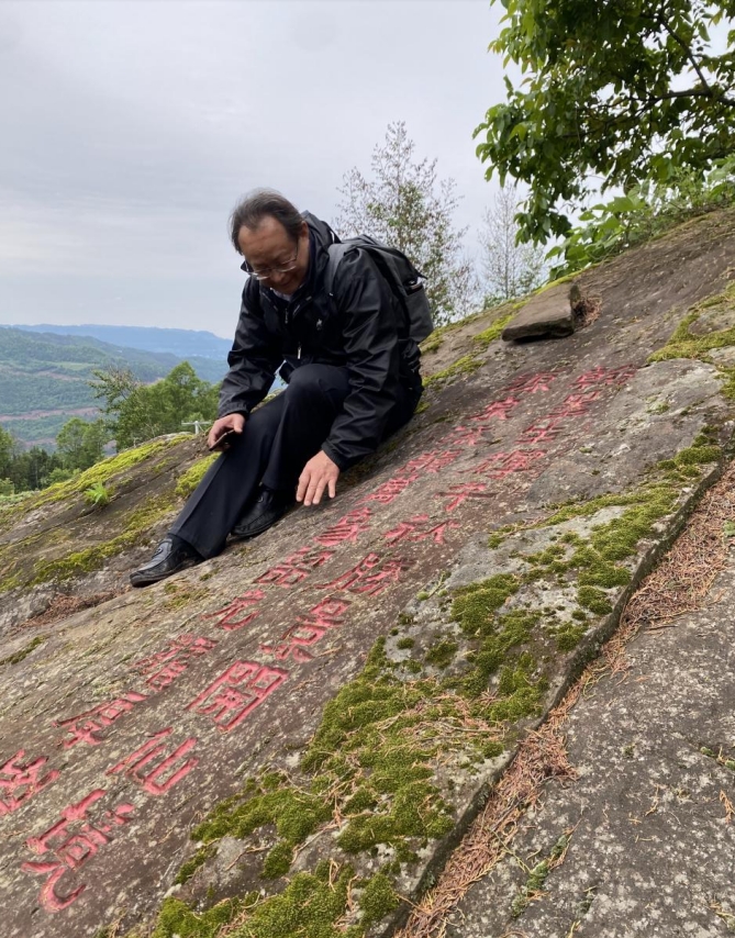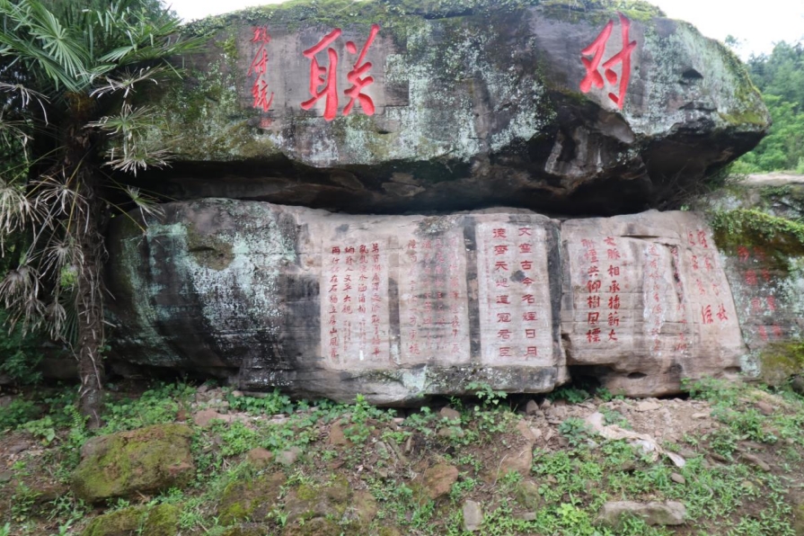 山上隨處是石,或臥或立,俱有雄獅虎豹之勢;或平或峻,皆作岡陵之態(tài)。青峰續(xù)脈,絕頂鷹飛。鑿巖壁以造法像,栩栩如臨宮闕;摩巨石而鐫嘉聯(lián),文華直射牛斗。石多瑰偉,苔覆璞瑜,油菜花點(diǎn)綴其間,引來蜜蜂蝴蝶共舞。山茶與毛竹同畦,郁郁蔥蔥;峰巒與云煙共養(yǎng),莽莽蒼蒼。遇目石上鐫字,瀏賞翰墨煙霞;振藻揚(yáng)毫,皆寰中俊杰;椽筆斯文,多隴蜀賢達(dá)?;虺嘧痈文?,燭照于史;或凜然浩氣,嘯傲大千。聯(lián)壁生輝,文曲星彰;峣巖開竅,氣通神明。文采煥然與星河同輝,詩儕競秀潤厚山玉顏。壯懷詩夢,漱玉溪流。在一塊巨石斜面上,有同伴發(fā)現(xiàn)刻有筆者所書長聯(lián),興奮得喊叫起來。這是三年前應(yīng)曹興章先生之約而作,聯(lián)曰:翰墨生輝,千秋勝景開仙境;源泉流韻,萬象韶光耀厚山。我用手指扣去筆畫生出的茂密青苔,坐下來與我的聯(lián)合影留念。信是蓮花開石上,遙遙至此結(jié)仙緣。