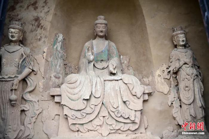 麥積山石窟第44窟的西魏泥塑一佛二菩薩組像。主尊佛像被譽(yù)為“東方美人”。九美旦增 攝