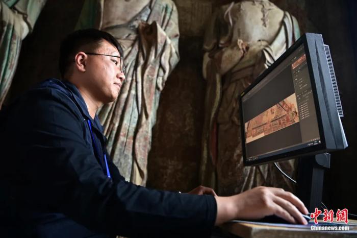 甘肅天水,工作人員在麥積山石窟內(nèi)檢查數(shù)字化掃描的造像和壁畫信息。九美旦增 攝