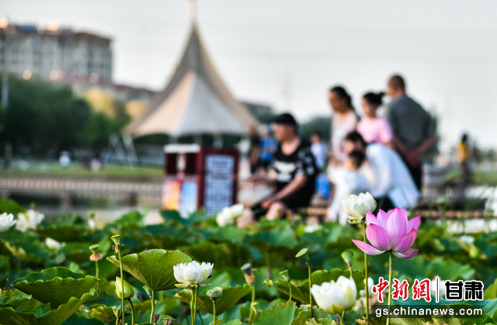 “接天蓮葉無(wú)窮碧,映日荷花別樣紅。”盛夏時(shí)節(jié),敦煌大漠綠洲持續(xù)高溫,鳴沙山下各種植物茁壯生長(zhǎng),黨河風(fēng)情線上的荷塘里荷花也競(jìng)相綻放,紅的、白的,一朵朵,一簇簇,在微風(fēng)中搖曳,吸引眾多游人前來(lái)休閑避暑,賞荷納涼。王斌銀 攝