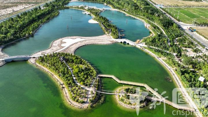 2024年7月27日,航拍甘肅省酒泉市金塔縣城西生態(tài)湖,綠意盎然,生機(jī)勃勃,構(gòu)成了“戈壁水鄉(xiāng)”的獨(dú)特畫卷。中新社發(fā) 曹紅祖 攝