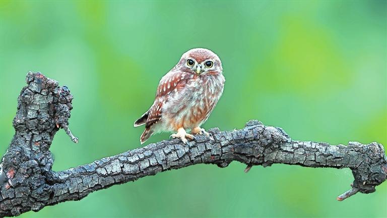 我近距離地看著這小小的、聰慧的鳥兒。它的上體是棕黃色的,散布著許多白點,頭上的白點比身上的更加細密。貓頭鷹脖子的轉(zhuǎn)動極限大約是270度,能水平轉(zhuǎn),也能上下轉(zhuǎn),這個“超能力”讓眼前的小家伙能更靈活機敏地打量我。它的眼周有一圈兒顯眼的白色,于喙的上方幾乎相連,變成兩道白色的眉毛,平添了幾分威武。