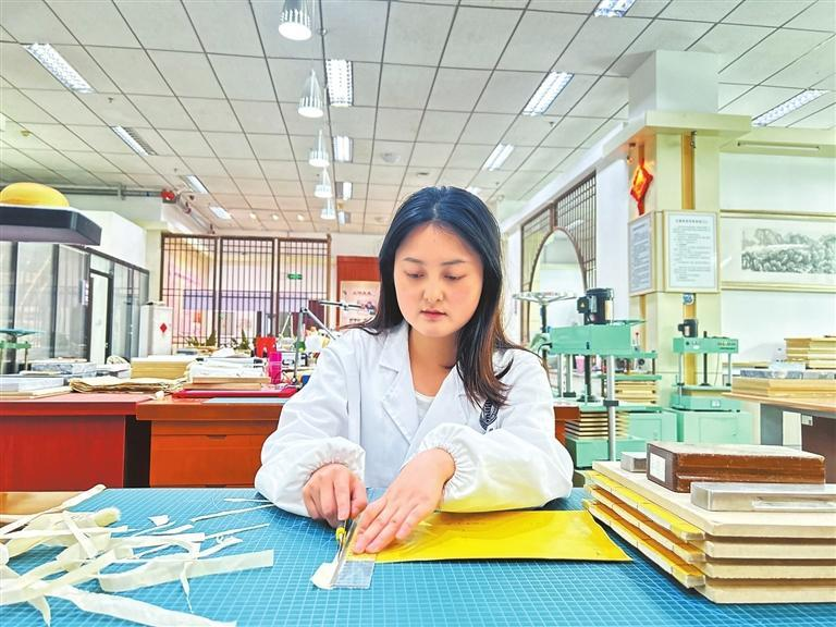 今年23歲的羅雪瑞是保護中心里的古籍修復(fù)師。她告訴記者:“在學校時學的是工藝美術(shù)品設(shè)計專業(yè)書畫裝裱方向,需要很強的動手能力,這為古籍修復(fù)工作打下了很好的基礎(chǔ)。”