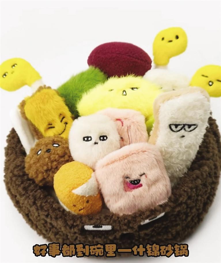 記者看到,“麻辣燙”和“砂鍋”毛絨玩具花束有多個單品,模擬了丸子、蟹排、年糕、香菇等菜品。而且每款都有自己的名字——嘻嘻西蘭花、香香香菇、黏黏年糕、哇哇菜、謝謝蟹排、玩去吧丸子??蓯塾腥さ拿q玩具再次走紅網(wǎng)絡(luò),成為不少“大朋友”的必入文創(chuàng)單品。連日來,這款單品引發(fā)近20萬人涌入天貓旗艦店搶購,“麻辣燙”幾度售罄。甘肅省博物館文創(chuàng)中心負責人崔又心介紹,“麻辣燙”火了之后,天貓店客服每天都會收到來自消費者“求補貨”留言。