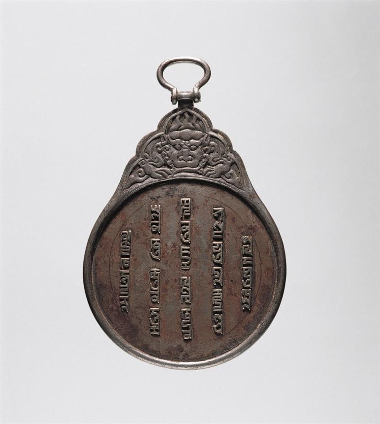 八思巴文虎頭銀符鐵牌,元代,符牌兩面鑲嵌八思巴文銀字,譯為“上天眷命,皇帝聖旨:如不欽奉虔敬,治罪”。廓外上有葉狀鈕座,座內(nèi)鑄虎頭紋,座頂有橢圓形環(huán)鈕。這種虎符圓牌專(zhuān)為傳遞“軍情急務(wù)”而設(shè),持之可進(jìn)出全國(guó)各地及四大汗國(guó),域跨歐亞,故有“國(guó)際通行證”之稱(chēng),是研究元代急遞制度以及政治史、民族文字等方面的珍貴實(shí)物資料。這種符牌使用范圍十分嚴(yán)格,故全世界現(xiàn)存數(shù)量極少。