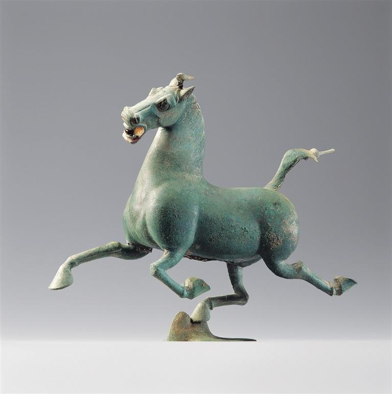 銅奔馬,東漢,1969年武威市雷臺(tái)墓出土。馬作奔騰狀,三足騰空,右后蹄踏一展翅飛翔、回首驚顧的飛鳥(niǎo)。奔馬全身著力點(diǎn)集于超掠飛鳥(niǎo)的一足之上,準(zhǔn)確地把握了力學(xué)平衡。蹄踏飛鳥(niǎo),表現(xiàn)出馬行迅疾,在鳥(niǎo)驚回首的剎那已經(jīng)超越了飛行的鳥(niǎo)。銅奔馬鑄造精美,構(gòu)思巧妙,為我國(guó)青銅藝術(shù)中罕見(jiàn)的杰作,1983年被確定為中國(guó)旅游標(biāo)志,2002年被國(guó)家文物局列入首批禁止出國(guó)(境)展覽文物目錄。它以卓絕的藝術(shù)造詣千古生輝,成為中華民族勇往直前、積極進(jìn)取偉大氣質(zhì)的象征。
