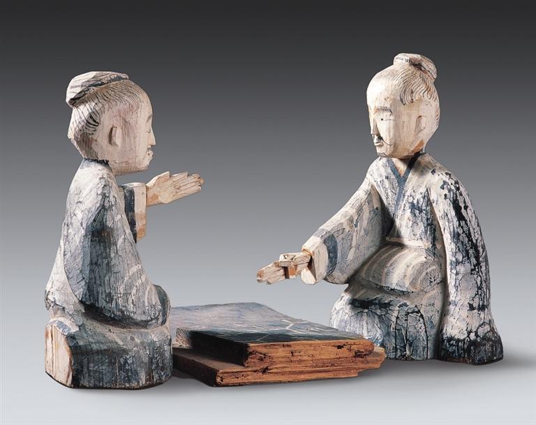 彩繪木六博俑,西漢,武威磨嘴子出土。木俑為兩位跪坐對(duì)局的老者形象,二者間設(shè)一長(zhǎng)方形棋盤(pán)。老者神情凝滯,蓄勢(shì)待發(fā),顯然正在緊張的六博對(duì)局之中。考古發(fā)現(xiàn)中不乏漢代博局、棋子、骰子等六博器具,漢墓畫(huà)像磚中也常見(jiàn)相關(guān)圖像,但以雕塑刻畫(huà)六博對(duì)局卻極為罕見(jiàn),這件文物充分體現(xiàn)了漢代木雕藝術(shù)所達(dá)到的高度與境界。