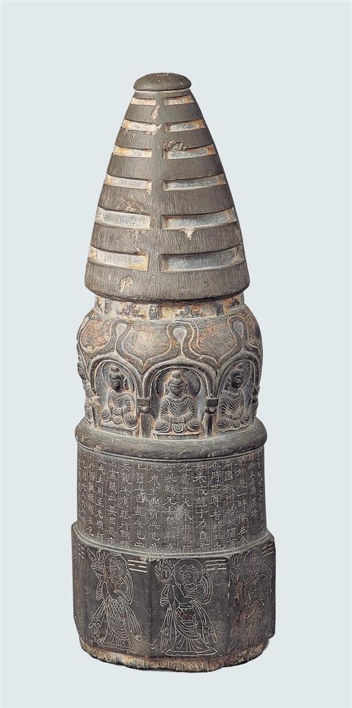高善穆石造像塔,1969年甘肅省酒泉市出土。寶蓋、相輪、塔頸、塔肩、塔基一應(yīng)俱全,底部有榫頭。寶蓋頂端中間刻北斗七星,塔腹陰刻《增一阿含經(jīng)·結(jié)禁品》的前半部分及發(fā)愿文,有承玄元年(公元428年)紀(jì)年。塔基為八面形,每面陰刻一像,像左側(cè)上方刻八卦符號(hào)。該造像塔是現(xiàn)存北涼石塔中保存最完整的一件,在造型上繼承了犍陀羅供養(yǎng)小塔的基本造型特征,又有了新的發(fā)展,如塔頂端的北斗七星,塔基的八卦符號(hào)等,體現(xiàn)出佛教文化和中國(guó)本土文化之間的碰撞和融合,是研究早期佛教藝術(shù)和佛教思想的重要標(biāo)本。