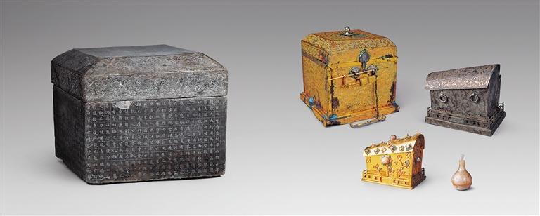 大云寺五重舍利寶函,涇川縣大云寺出土。最外層的石函由質(zhì)地堅(jiān)硬的灰色大理石制成,四壁陰刻《涇州大云寺舍利石函銘并序言》,并有參與舍利發(fā)現(xiàn)和奉安儀式的職官、僧眾題名,共千余字,紀(jì)年為“延載元年”(公元694年)。其內(nèi)層層套置鎏金銅匣、銀槨、金棺和玻璃舍利瓶,舍利瓶?jī)?nèi)裝舍利14粒,形如米粒。這套舍利容器精巧華麗,光彩奪目,反映了盛唐時(shí)期金銀細(xì)工的最高技藝。這套舍利容器是考古發(fā)現(xiàn)最早的以中國(guó)傳統(tǒng)棺槨制度設(shè)計(jì)舍利容器,并置于地宮之中實(shí)例,是佛教文化與中國(guó)本土習(xí)俗相融合的重要實(shí)物見(jiàn)證。