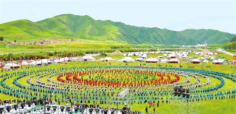 壯觀的萬(wàn)人鍋莊舞展演在碌曲縣夏澤灘草原上演。新甘肅·甘肅日?qǐng)?bào)記者 馬伊星
