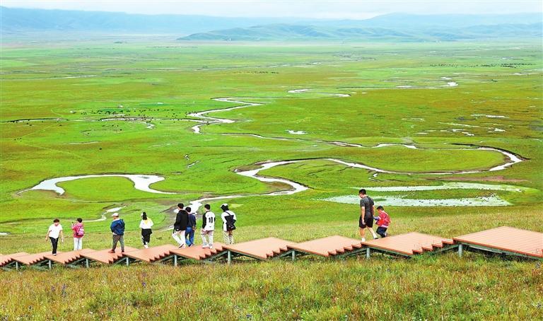 游客在瑪曲縣阿萬(wàn)倉(cāng)黃河濕地公園游玩。新甘肅·甘肅日?qǐng)?bào)記者 田蹊