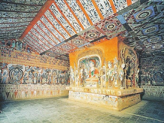 另一個(gè)創(chuàng)新改良的洞窟建筑是中心塔柱窟,其原型是印度支提窟。洞窟平面多呈倒U形;窟內(nèi)空間多被兩列石柱縱向分成三部分,中間是主室,既寬又高,兩邊是側(cè)廊,較低而且比較窄;主室前端是入口,后端是半圓形后室;后室中央雕鑿佛塔,兩側(cè)石柱在佛塔后部相接;主室的頂部為縱向肋骨筒拱,側(cè)廊頂部為半圓扇形。這樣佛教徒就可以經(jīng)過(guò)側(cè)廊進(jìn)行繞塔禮拜。在莫高窟北朝第二期洞窟里,中心塔柱才開(kāi)始大量出現(xiàn),并一直興盛到初唐。