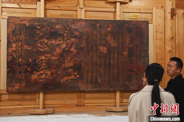 10月23日,甘肅省天水市秦安縣明清街秦安匾額博物館,游人參觀歷史名人胡纘宗所題《世代昌隆》的匾額。中新社記者 李亞龍 攝
