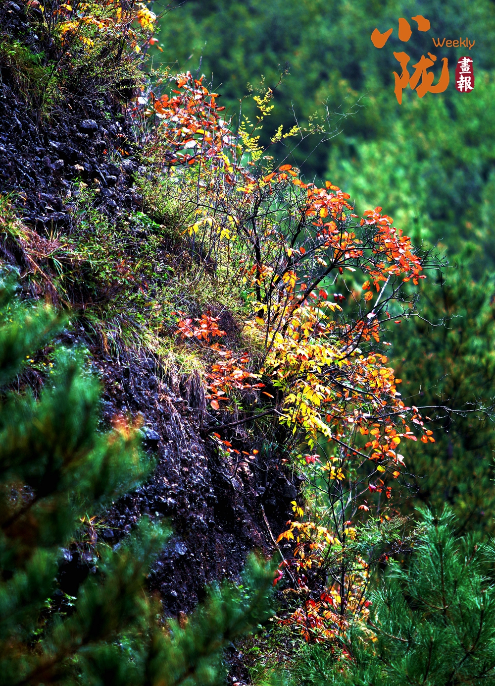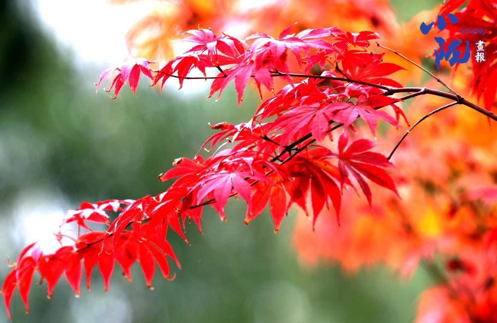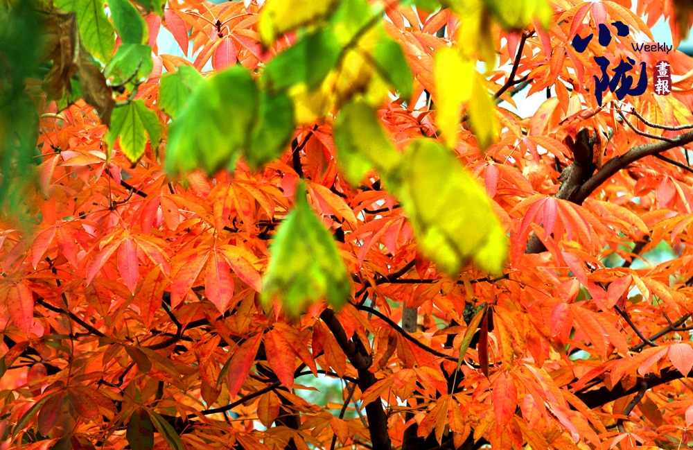 淡淡的秋霜將樹葉染成綺麗多彩的鮮紅和金黃,與綠葉共舞,層層疊疊,在凋零中展現(xiàn)生命的堅(jiān)韌。