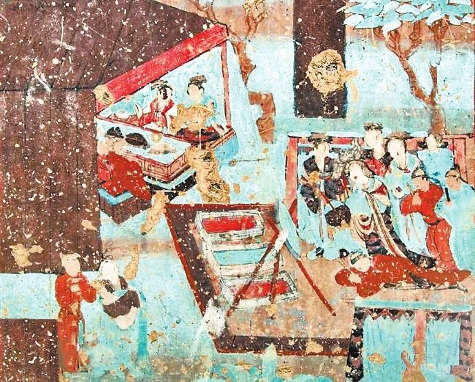古人會在一年的歲末舉行一次集體聚會,稱作“建福”。在敦煌文獻《社司轉帖》中寫道:“右緣常年建福一日,人各爐餅壹雙,凈粟壹斗。幸請諸公等,帖至限今月廿二日卯時于安家酒店取齊。”意思是說,只要有可能,每年到了年末大家都要選擇一日來進行建福。每家每戶需要按時把準備建福的物資送過來。唐朝詩人李白在《客中行》一詩中寫道:“蘭陵美酒郁金香,玉碗盛來琥珀光。但使主人能醉客,不知何處是他鄉(xiāng)。”意思是說蘭陵美酒甘醇甜美,就像郁金香一樣芬芳四溢。興來盛滿玉碗,泛出琥珀光晶瑩迷人。主人端出如此好酒,定能醉倒他鄉(xiāng)之客。飲酒之后哪能分清故鄉(xiāng)與他鄉(xiāng)呢?歲暮聚飲蘊含有辭舊迎新、攘兇納吉的美好愿望。在莫高窟第12窟壁畫中有一幅“帳篷酒肆圖”:畫面中圍坐在條形長桌兩邊正盡興暢飲的客人為七人,還有兩個熱情忙碌的服務人員。整個畫面是一幅酒酣耳熱、興致高昂的歡飲圖。更為氣勢恢宏、熱鬧非凡的是莫高窟第23窟壁畫中一幅“院落圖”:畫面中分院落之內與院落之外兩個部分,院落之內是世俗的世界,畫面上布局著鱗次櫛比的廳堂房屋,有人正在庖廚、有人正在對弈、有人正在暢聊、有人正在團聚,也有人正在說教,總之表現(xiàn)的是我們日常生活的百態(tài)。院落之外是佛國世界,整體呈現(xiàn)出肅穆莊嚴之感。有趣的是在佛國與世俗世界中間,畫的是服飾艷麗,騎馬遠行的人們。