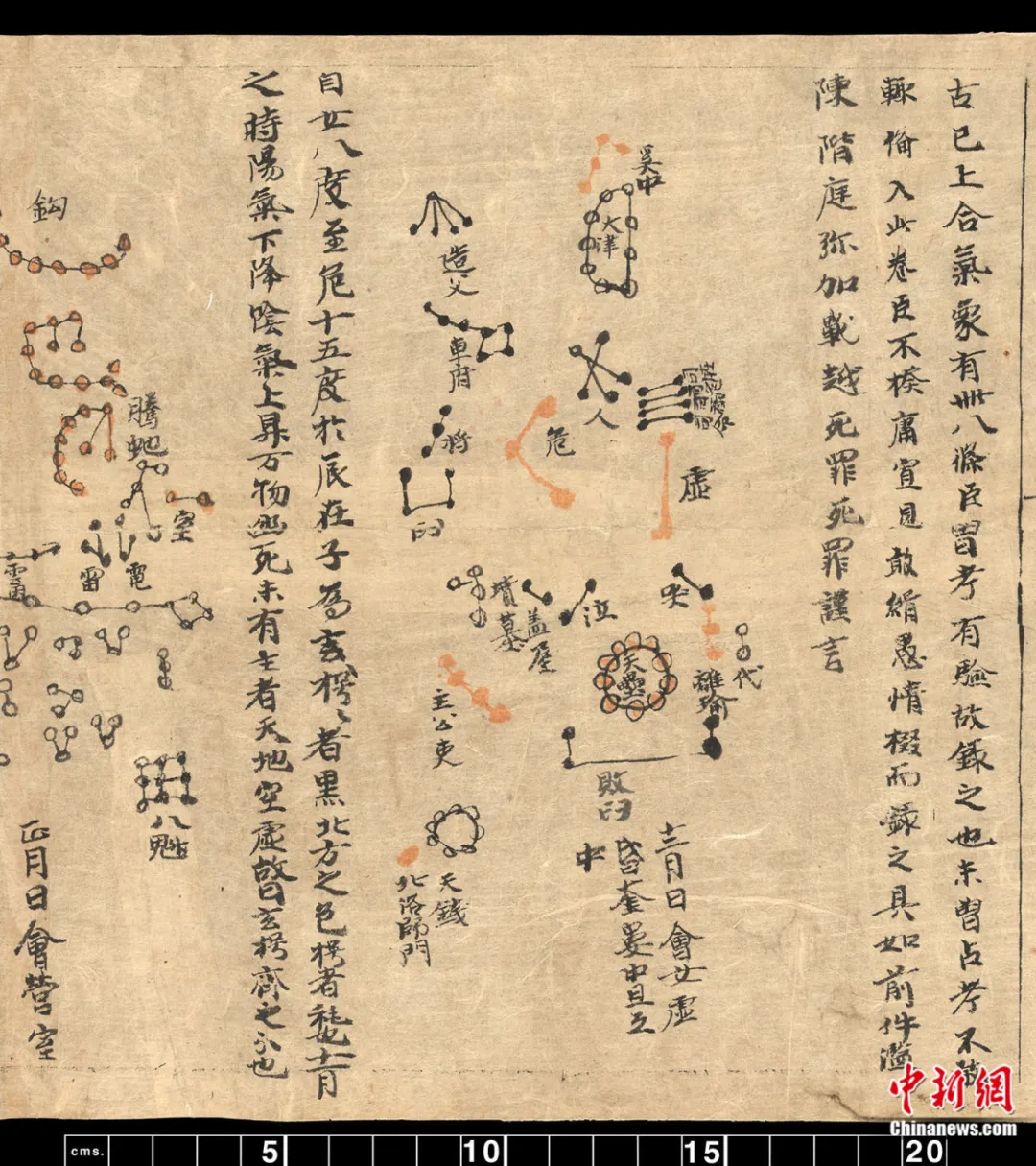 古代中國對天象變化的關注,促進了古代天文學的產(chǎn)生?!度煨菆D》包括了當時北半球肉眼所能見到的大部分恒星,也很容易辨認出北極星宮和北斗星的位置。而且每一顆星都是比對而畫就,它們的位置誤差相當小,約在1.5°至4°之間。