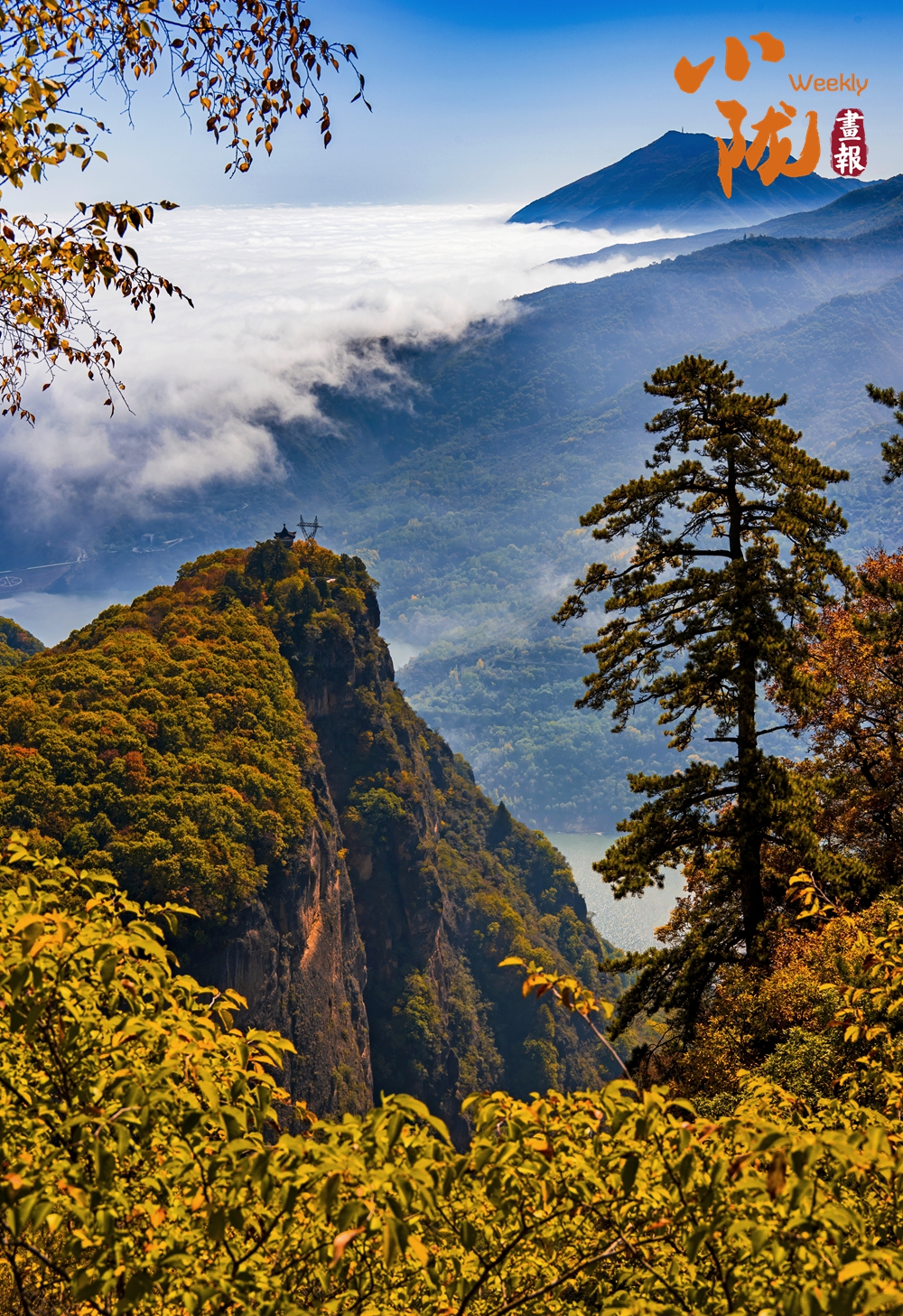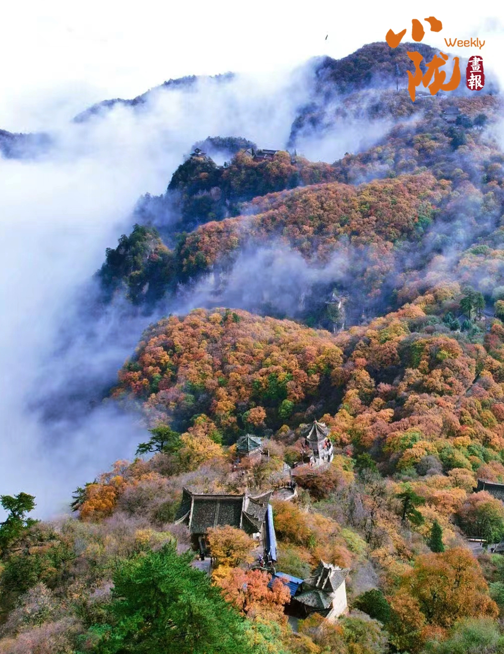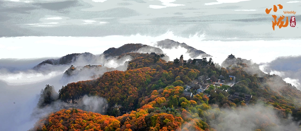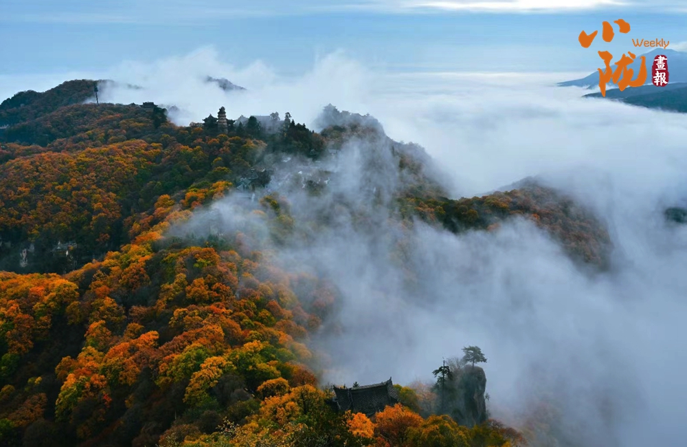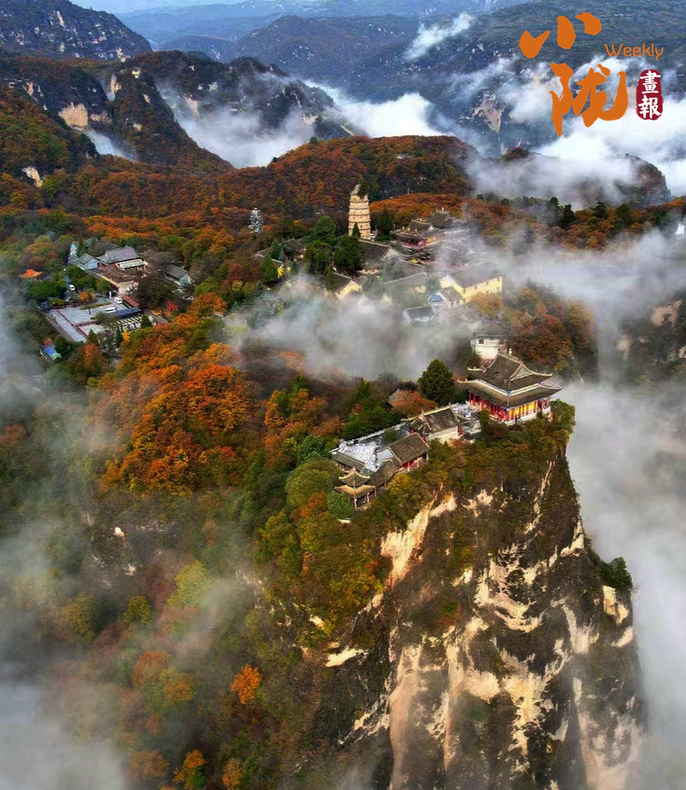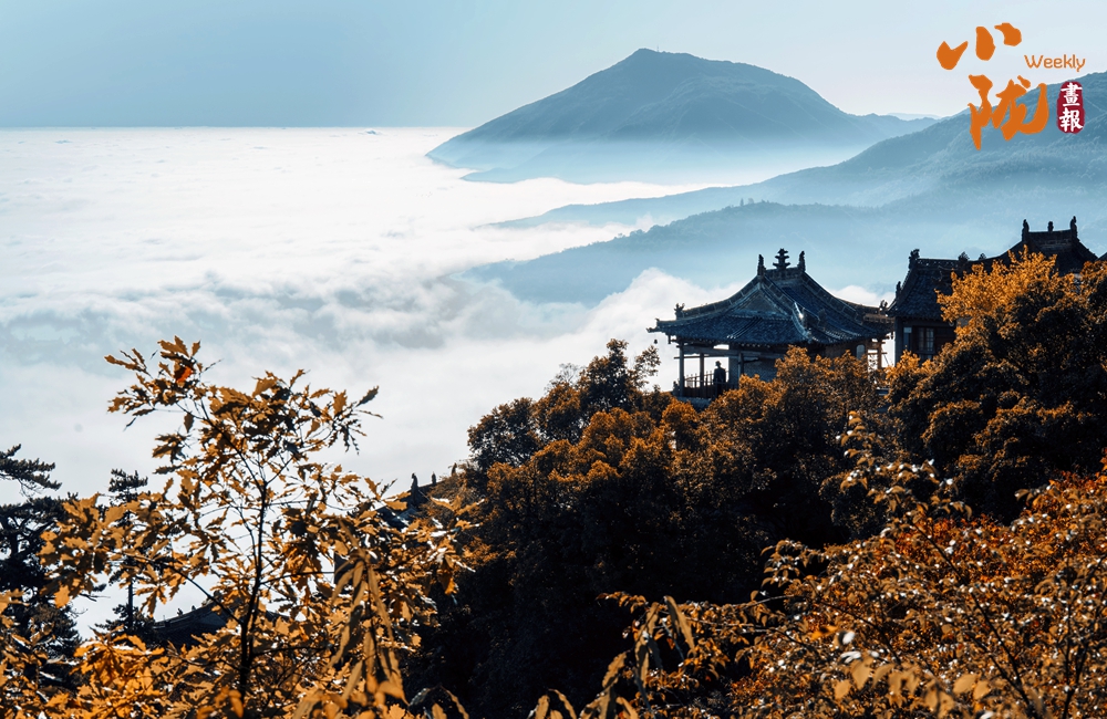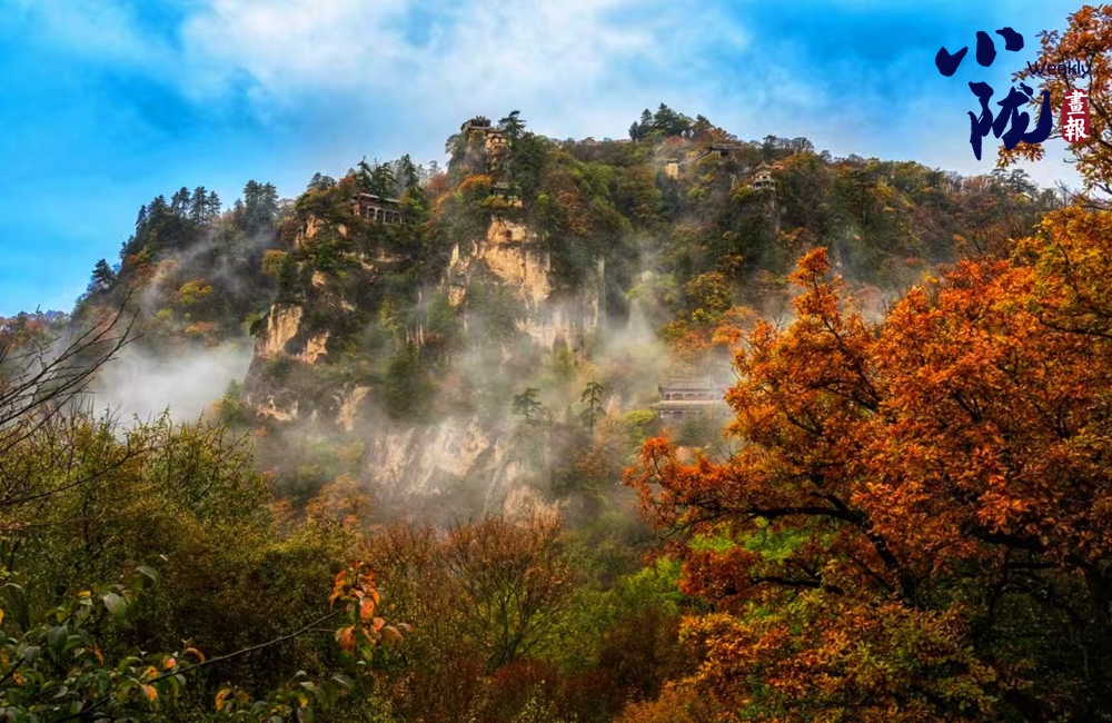 一葉知冬,遍地金黃。五彩斑斕的林木與古香古色的建筑、遠(yuǎn)處的山巒云霧相映成趣,盡顯詩意之美。