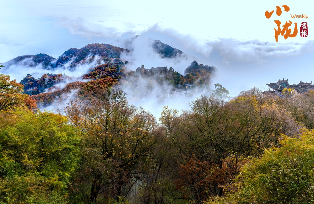 云霧繚繞,金黃的葉子似金色海洋,覆蓋山脈,在陽光照耀下散發(fā)著溫暖光芒,仿佛為崆峒山披上了璀璨外衣。