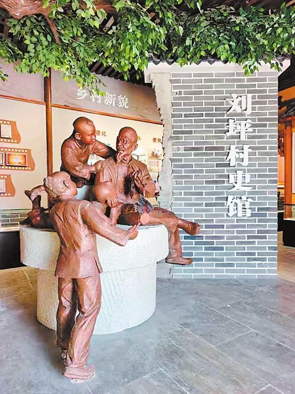 年復(fù)一年的寒來暑往中,大榆樹,也就成了劉坪村的望鄉(xiāng)臺。每個村莊,都有它的望鄉(xiāng)臺,它承載著人們共同的記憶,是人們重溫鄉(xiāng)愁的地標,永遠鐫刻在人們的心底。2000年,電視劇《黃沙下面是沃土》的劇組來到劉坪村拍攝取景,村里的望鄉(xiāng)臺大榆樹被拍進電視劇畫面。在劉坪村村史館布設(shè)中,專家和學(xué)者數(shù)易村史館方案,最終確定在村史館正門之內(nèi)塑造一組雕塑,意思是由一位老人講述劉坪村的村史,作為村史館的題眼,村史館內(nèi)還陳列了《劉坪村志》,分為建置、地理、村落文化、風土人情等14卷,共40萬字。館內(nèi)能播放劉坪村村史專題片《耕讀傳家》。