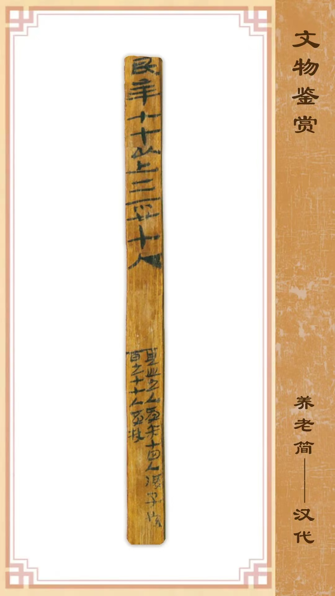 1990年出土于甘肅省敦煌懸泉置遺址,長22.8厘米,寬1厘米,紅柳材質(zhì)。該簡記載分類統(tǒng)計高年老人享受的待遇,是西漢后期養(yǎng)老制度的反映。