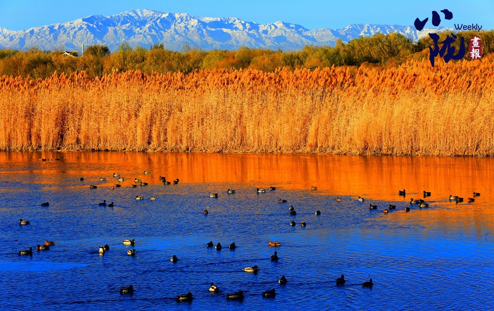 濕地天晴,碧水環(huán)繞,萬(wàn)畝葦蕩一片金黃,仿佛是一幅富有層次感的油畫,令人陶醉。