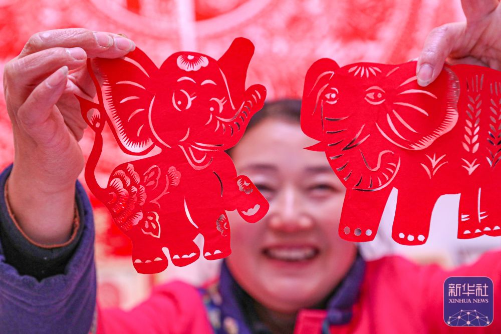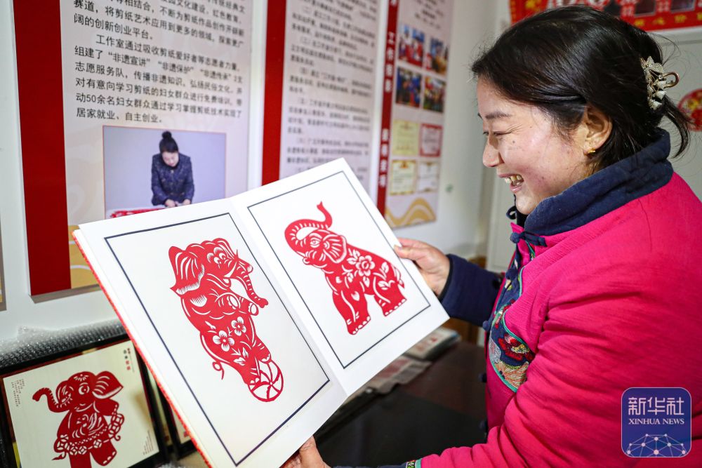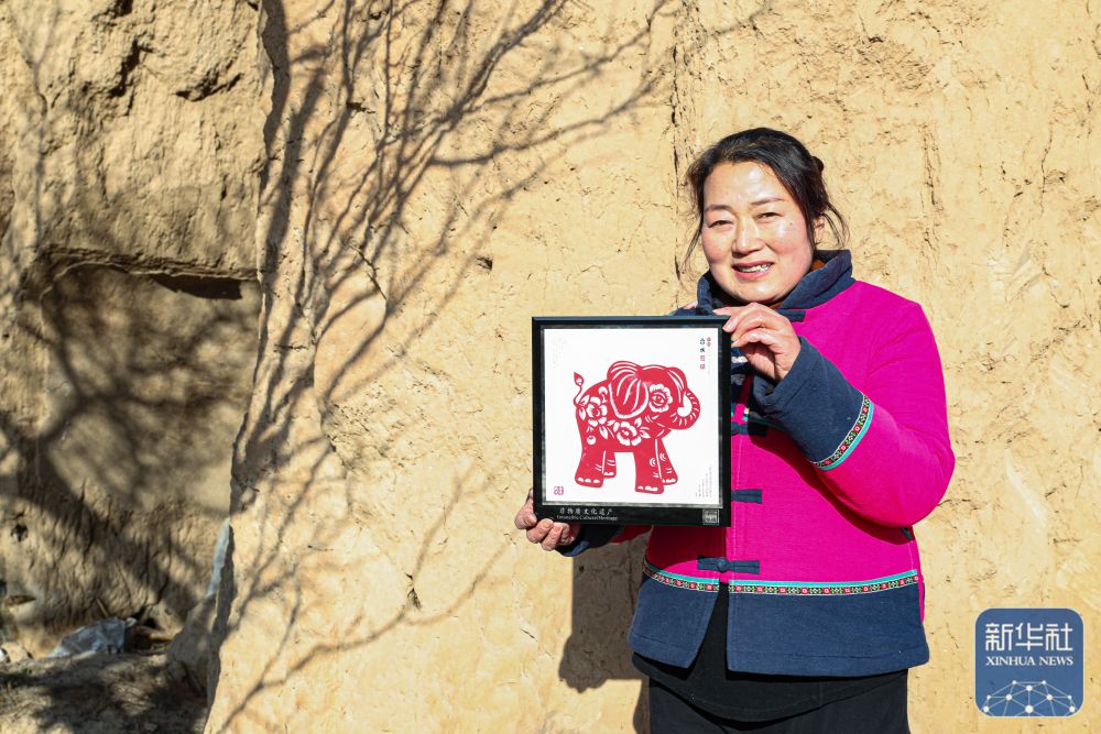 1月4日,在慶陽(yáng)市合水縣西華池鎮(zhèn)唐旗村,張雪峰展示黃河古象主題剪紙作品。