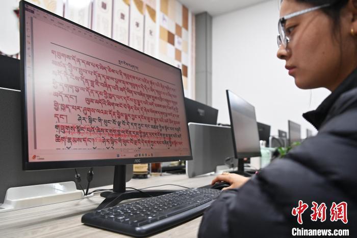 2月27日,在甘肅甘南藏族自治州碌曲縣益西達(dá)吉科技有限公司內(nèi),工作人員正在進(jìn)行藏文古籍?dāng)?shù)字化相關(guān)工作。該公司主要從事民族古籍?dāng)?shù)字化建設(shè)和古籍文獻(xiàn)數(shù)據(jù)庫建設(shè),自2019年以來,承擔(dān)西藏、四川、甘肅等省區(qū)的藏文古籍?dāng)?shù)字化項(xiàng)目。圖為工作人員用該公司研發(fā)的藏文信息處理系統(tǒng)對古籍?dāng)?shù)字化內(nèi)容進(jìn)行檢查。中新社記者 九美旦增 攝