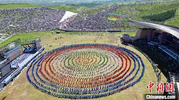 2024年8月4日,第22屆九色甘南香巴拉旅游藝術(shù)節(jié)在甘肅省甘南藏族自治州當(dāng)周草原開(kāi)幕。圖為開(kāi)幕式現(xiàn)場(chǎng)鍋莊舞表演。(資料圖)九美旦增 攝