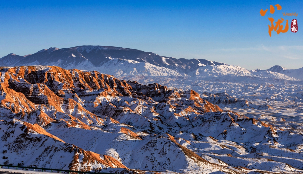 紅色丹霞被春雪覆蓋,在陽光的照耀下,紅色山崖層層疊疊、縱橫交錯,皚皚白雪點綴其中,唯美壯觀。平山湖的山,就在這樣悄無聲息的雪中,幻化成了氣勢磅礴的丹霞,綿延千里,浩瀚無邊。