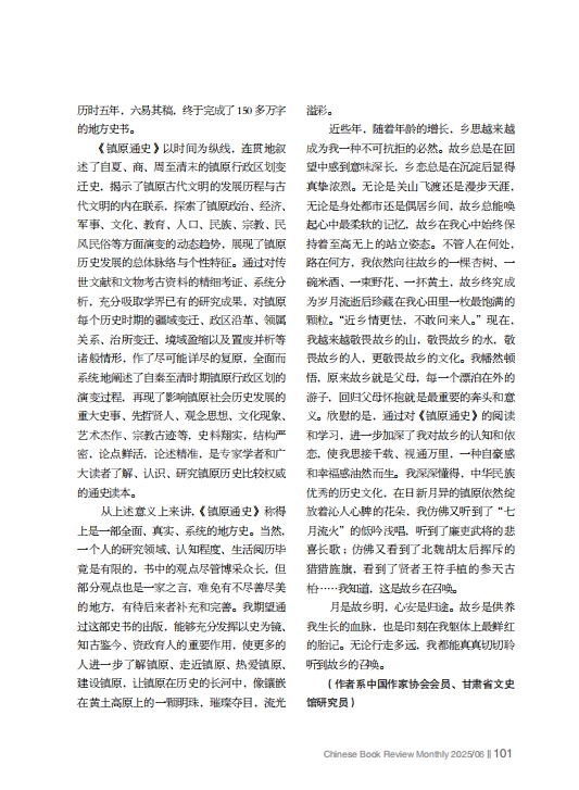 從上述意義上來(lái)講,《鎮(zhèn)原通史》稱得上是一部全面、真實(shí)、系統(tǒng)的地方史。當(dāng)然,一個(gè)人的研究領(lǐng)域、認(rèn)知程度、生活閱歷畢竟是有限的,書中的觀點(diǎn)盡管博采眾長(zhǎng),但部分觀點(diǎn)也是一家之言,難免有不盡善盡美的地方,有待后來(lái)者補(bǔ)充和完善。我期望通過(guò)這部史書的出版,能夠充分發(fā)揮以史為鏡、知古鑒今、資政育人的重要作用,使更多的人進(jìn)一步了解鎮(zhèn)原、走近鎮(zhèn)原、熱愛(ài)鎮(zhèn)原、建設(shè)鎮(zhèn)原,讓鎮(zhèn)原在歷史的長(zhǎng)河中,像鑲嵌在黃土高原上的一顆明珠,璀璨奪目,流光溢彩。