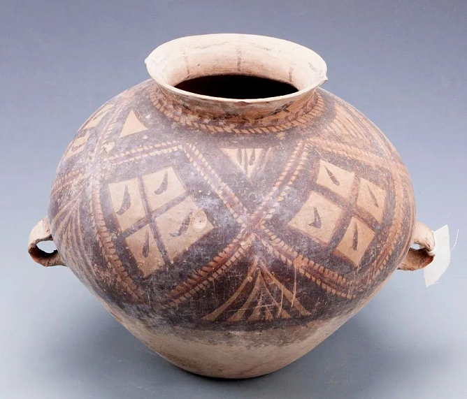 菱格紋是馬家窯文化半山類型彩陶的核心紋飾,由連續(xù)排列的菱形格構成,常見于壺、罐等器物的上腹部。該紋飾流行于公元前2650-2350年的馬家窯文化中期,典型器型如甘肅省廣河縣半山遺址出土的菱格紋彩陶雙耳罐。早期以大面積菱格為主體,晚期演變?yōu)樘畛渚W(wǎng)格或涂黑的輔助紋飾,至馬廠時期發(fā)展為四大圓圈紋內(nèi)裝飾。