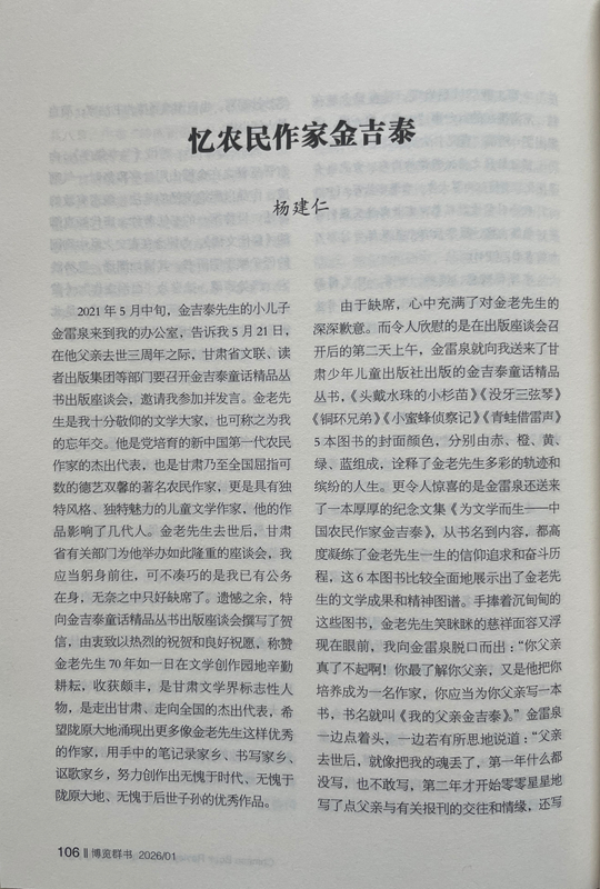 由于缺席,心中充滿了對金老先生的深深歉意。而令人欣慰的是在出版座談會召開后的第二天上午,金雷泉就向我送來了甘肅少年兒童出版社出版的金吉泰童話精品叢書,《頭戴水珠的小杉苗》《沒牙三弦琴》《銅環(huán)兄弟》《小蜜蜂偵察記》《青蛙借雷聲》5本圖書的封面顏色,分別由赤、橙、黃、綠、藍(lán)組成,詮釋了金老先生多彩的軌跡和繽紛的人生。更令人驚喜的是金雷泉還送來了一本厚厚的紀(jì)念文集《為文學(xué)而生——中國農(nóng)民作家金吉泰》,從書名到內(nèi)容,都高度凝練了金老先生一生的信仰追求和奮斗歷程,這6本圖書比較全面地展示出了金老先生的文學(xué)成果和精神圖譜。手捧著沉甸甸的這些圖書,金老先生笑瞇瞇的慈祥面容又浮現(xiàn)在眼前,我向金雷泉脫口而出:“你父親真了不起??!你最了解你父親,又是他把你培養(yǎng)成為一名作家,你應(yīng)當(dāng)為你父親寫一本書,書名就叫《我的父親金吉泰》。”金雷泉一邊點著頭,一邊若有所思地說道:“父親去世后,就像把我的魂丟了,第一年什么都沒寫,也不敢寫,第二年才開始零零星星地寫了點父親與有關(guān)報刊的交往和情緣,還寫了點父親在生活和寫作中的軼事趣聞。您的建議非常好,我擔(dān)心駕馭不好,試試看吧。”我感覺金雷泉有點為難,馬上又安慰他:“不急,你用兩三年時間慢慢寫。”