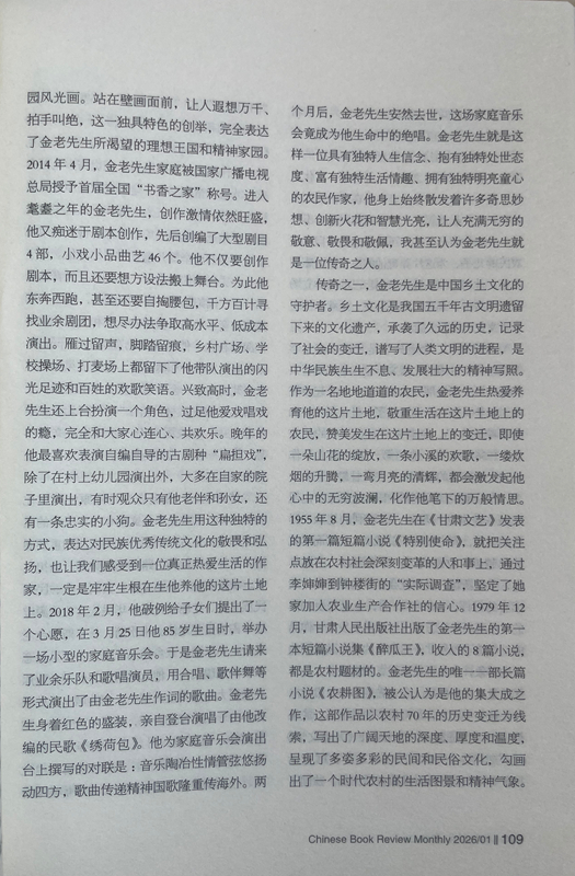 從此之后,我與金老先生的交往越來越密切,交流的話題也越來越廣泛,每次見面,他給我最多的就是鼓勵:“小楊啊,你在《人民日報》上發(fā)表的寫奧運會的散文,看得我都激動了。”“小楊啊,《詩刊》上發(fā)表大作了,值得祝賀!”“小楊啊,你的創(chuàng)作達(dá)到了新的水準(zhǔn),都登上國刊《人民文學(xué)》了。”有一次,金老先生得知我在《星星》詩刊舉辦的首屆農(nóng)民工詩歌大獎賽中獲獎的消息后,專門打來電話:“小楊啊,向你表示祝賀,你的獲獎作品表達(dá)了我們農(nóng)民工的心聲!”金老先生與人相處,傳遞的絕對是正能量,從我與他交往的30多年時光里,從來沒有聽到過他非議別人。后來才慢慢發(fā)現(xiàn),他有與眾不同的精神境界、質(zhì)樸品格、為人方式和處事態(tài)度,他靈魂深處永遠(yuǎn)流淌著向善、向上、向真、向美的價值取向,渾身上下始終洋溢著執(zhí)著、豁達(dá)、樂觀、寬容的人格魅力。一個地地道道的農(nóng)民,從當(dāng)年只有小學(xué)文化程度,靠勤奮自學(xué)70年堅持筆耕不輟,出版各種作品集25部,共計400多萬字,被中共甘肅省委、甘肅省人民政府授予“甘肅省文藝終身成就獎”。對一個農(nóng)民來說,這在全國也是屈指可數(shù)的。年近80歲的時候,在患嚴(yán)重眼疾幾乎導(dǎo)致雙目失明的情況下,每天堅持寫作兩三千字,用10個月時間,完成了45萬字的長篇小說《農(nóng)耕圖》,榮獲甘肅省文學(xué)藝術(shù)類政府最高獎——敦煌文藝獎,金老先生的頑強毅力和拼命勁頭也是罕見的。20世紀(jì)80年代初,他以家鄉(xiāng)榆中縣金崖鄉(xiāng)文化站為依托,創(chuàng)辦了全省第一個農(nóng)民文學(xué)社——苑川文學(xué)社,舉辦“文學(xué)創(chuàng)作講習(xí)班”,吸引方圓村鎮(zhèn)100多名“泥腿子”文學(xué)愛好者參與其中,每當(dāng)經(jīng)他修改、推薦的作品發(fā)表后,年過半百的他總是騎上自行車跑幾十公里路,喜滋滋地將樣報樣刊送到作者手里,金老先生樂此不疲為文學(xué)愛好者全方位服務(wù)的情懷,在當(dāng)下是不多見的,更加顯得彌足珍貴。興趣廣泛的金老先生在晚年時突發(fā)奇想,在老宅院子里啟動了家庭美化工程,自己設(shè)計、自己施工,在自家院子西墻上,用五顏六色的小石子創(chuàng)作了一幅長八米、寬二米的巨型壁畫,畫面上有紅日、山水、碌碡、西瓜、樹木、小鹿、大雁、人物,還有太陽灶、飛機、衛(wèi)星,好一幅天人合一的田園風(fēng)光畫。站在壁畫面前,讓人遐想萬千、拍手叫絕,這一獨具特色的創(chuàng)舉,完全表達(dá)了金老先生所渴望的理想王國和精神家園。2014年4月,金老先生家庭被國家廣播電視總局授予首屆全國“書香之家”稱號。進入耄耋之年的金老先生,創(chuàng)作激情依然旺盛,他又癡迷于劇本創(chuàng)作,先后創(chuàng)編了大型劇目4部,小戲小品曲藝46個。他不僅要創(chuàng)作劇本,而且還要想方設(shè)法搬上舞臺。為此他東奔西跑,甚至還要自掏腰包,千方百計尋找業(yè)余劇團,想盡辦法爭取高水平、低成本演出。雁過留聲,腳踏留痕,鄉(xiāng)村廣場、學(xué)校操場、打麥場上都留下了他帶隊演出的閃光足跡和百姓的歡歌笑語。興致高時,金老先生還上臺扮演一個角色,過足他愛戲唱戲的癮,完全和大家心連心、共歡樂。晚年的他最喜歡表演自編自導(dǎo)的古劇種“扁擔(dān)戲”,除了在村上幼兒園演出外,大多在自家的院子里演出,有時觀眾只有他老伴和孫女,還有一條忠實的小狗。金老先生用這種獨特的方式,表達(dá)對民族優(yōu)秀傳統(tǒng)文化的敬畏和弘揚,也讓我們感受到一位真正熱愛生活的作家,一定是牢牢生根在生他養(yǎng)他的這片土地上。2018年2月,他破例給子女們提出了一個心愿,在3月25日他85歲生日時,舉辦一場小型的家庭音樂會。于是金老先生請來了業(yè)余樂隊和歌唱演員,用合唱、歌伴舞等形式演出了由金老先生作詞的歌曲。金老先生身著紅色的盛裝,親自登臺演唱了由他改編的民歌《繡荷包》。他為家庭音樂會演出臺上撰寫的對聯(lián)是:音樂陶冶性情管弦悠揚動四方,歌曲傳遞精神國歌隆重傳海外。兩個月后,金老先生安然去世,這場家庭音樂會竟成為他生命中的絕唱。金老先生就是這樣一位具有獨特人生信念、抱有獨特處世態(tài)度、富有獨特生活情趣、擁有獨特明亮童心的農(nóng)民作家,他身上始終散發(fā)著許多奇思妙想、創(chuàng)新火花和智慧光亮,讓人充滿無窮的敬意、敬畏和敬佩,我甚至認(rèn)為金老先生就是一位傳奇之人。