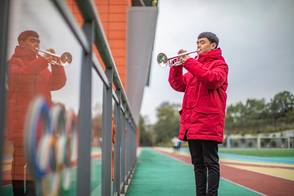 7年前,王太樊因先天性眼病完全失明,一度變得恐懼黑暗,情緒非常低落。音樂課上,他懵里懵懂地選擇了吹小號(hào)。練習(xí)一學(xué)期的吹號(hào)嘴之后,當(dāng)老師遞來一把銀光閃閃的小號(hào)時(shí),王太樊被自己吹出的聲音驚呆了:“這是我第一次感覺到‘自己能行’!”