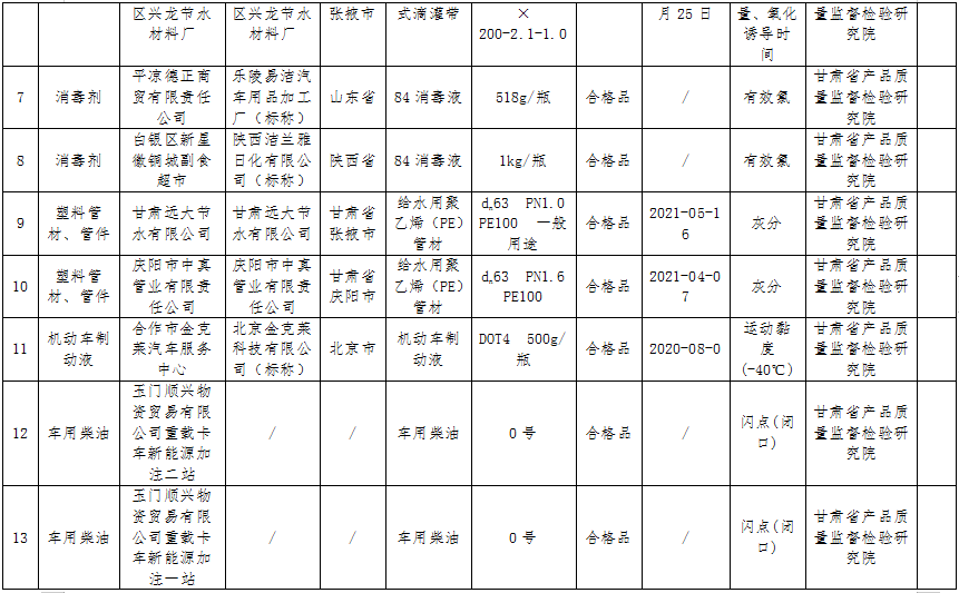 對抽檢發(fā)現(xiàn)的不合格產(chǎn)品,甘肅省市場監(jiān)管局已責(zé)成各市(州)市場監(jiān)管部門嚴(yán)格按照《產(chǎn)品質(zhì)量法》《產(chǎn)品質(zhì)量監(jiān)督抽查管理暫行辦法》等規(guī)定,認(rèn)真做好后處理工作,并將不合格產(chǎn)品生產(chǎn)(經(jīng)銷)企業(yè)后處理情況在規(guī)定時限內(nèi)上報。