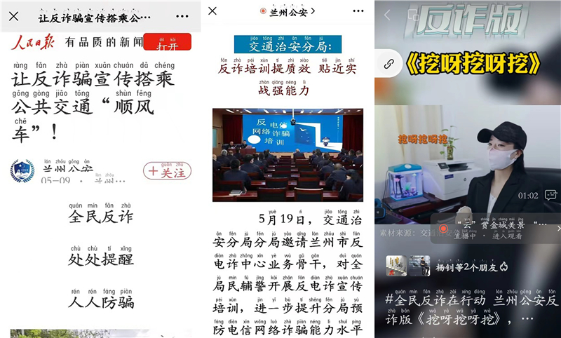 反電詐宣傳專(zhuān)班利用多媒體平臺(tái)錄制反電詐版“挖呀挖”,在各媒介平臺(tái)進(jìn)行了展播,廣大民輔警實(shí)時(shí)瀏覽并積極轉(zhuǎn)發(fā)。同時(shí),在中央及省市媒體廣泛刊發(fā)“五一”小長(zhǎng)假反詐宣傳不放假、讓反詐騙宣傳搭乘公共交通“順風(fēng)車(chē)”、全警參與、協(xié)同互動(dòng),讓蘭州市公安局交通治安分局防范電信網(wǎng)絡(luò)詐騙宣傳工作再發(fā)力。