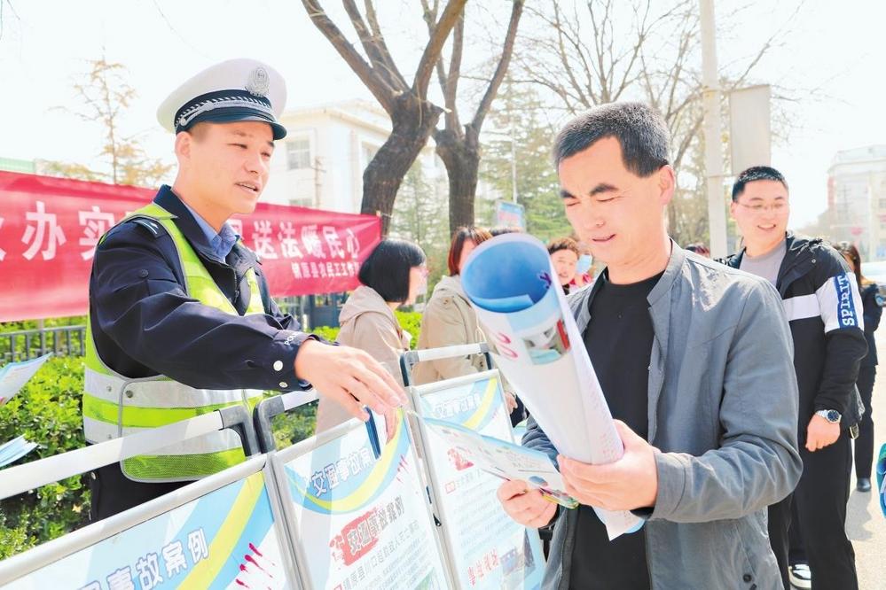 民警給過(guò)路群眾發(fā)放宣傳資料。4月8日,鎮(zhèn)原縣公安局交警大隊(duì)開展“春風(fēng)送法暖民心”主題宣傳活動(dòng)。新甘肅·甘肅法治報(bào)記者馬志國(guó)攝
