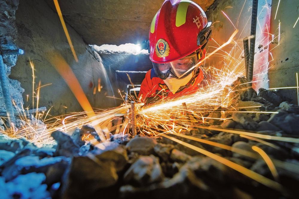 “噠噠噠……”在狹小的通道里,破拆隊員抱著鑿巖機與水泥板“死磕硬碰”。