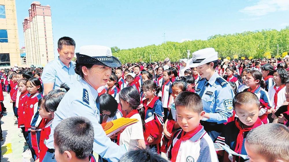 民警向?qū)W生發(fā)放宣傳資料。6月26日,積石山縣公安局交警大隊(duì)民警走進(jìn)城西小學(xué),開展“知危險(xiǎn)會(huì)避險(xiǎn)”交通安全宣傳教育活動(dòng),給學(xué)生們上了一堂暑期交通安全課。 新甘肅·甘肅法治報(bào)通訊員趙小紅攝