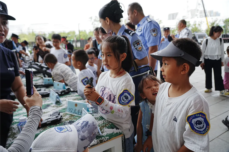 帶著興奮和期待,小朋友們的警營探索之旅開始了!在奧體中心警務站和警航作戰(zhàn)單元,他們沉浸式參觀了現(xiàn)代警務工作和警用無人機的指揮調(diào)度,直觀了解了公安工作的日常場景。另一邊,小朋友們在民警的指導下,一個個親手拿著警用武器裝備零距離“拍照打卡”,“這個好酷!”“看我的!”小朋友們的驚嘆聲此起彼伏。