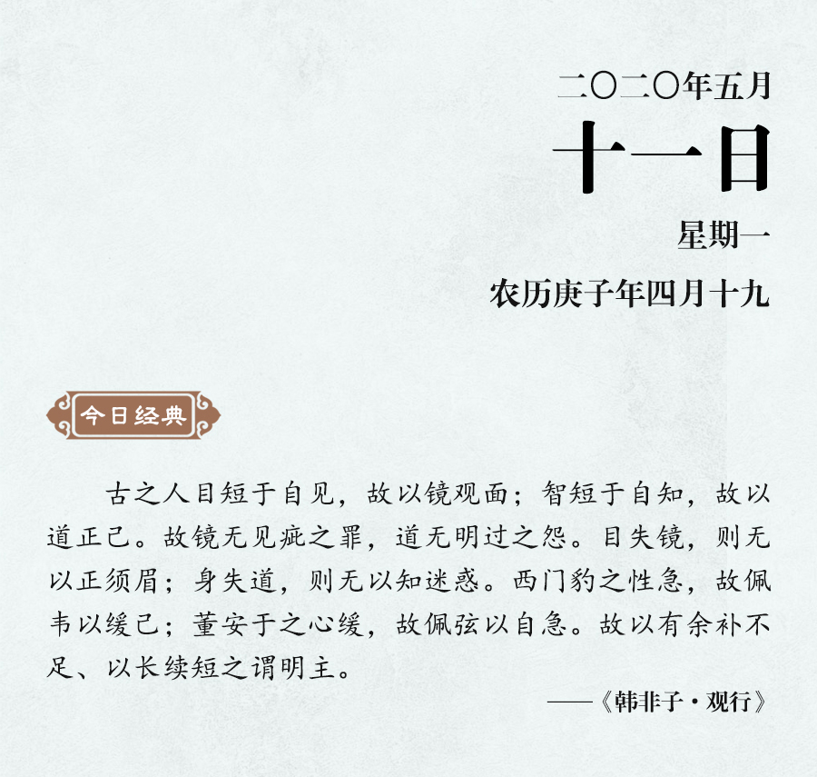 《老子》說:“知人者智,自知者明。”如果不能很好地認(rèn)識(shí)到自己的長(zhǎng)處和短處,就不能透徹地了解事物。韓非進(jìn)一步說:“目短于自見,故以鏡觀面;智短于自知,故以道正己。”無論是明君還是賢人,都要明確認(rèn)識(shí)到自身的不足,如此才能自知自見。“目失鏡則無以正須眉,身失道則無以知迷惑。”這既是說自見的局限,也是說自知的重要。韓非舉例說,魏國(guó)的西門豹因?yàn)樾愿窦痹?,所以佩戴柔軟的皮帶來提醒自己;董安于因?yàn)樾宰雍苈?,所以佩戴繃緊的弓弦來激勵(lì)自己,這兩位都是能夠自知不足的人。