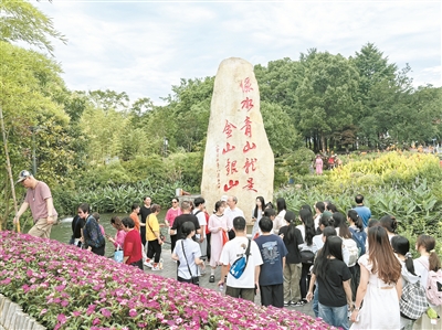 20年來,在綠水青山就是金山銀山理念的指引下,浙江省安吉縣余村努力修復(fù)生態(tài),發(fā)展生態(tài)旅游,探索出一條環(huán)境保護與經(jīng)濟發(fā)展相協(xié)調(diào)的新路。游客正在“綠水青山就是金山銀山”石碑前拍照留念。