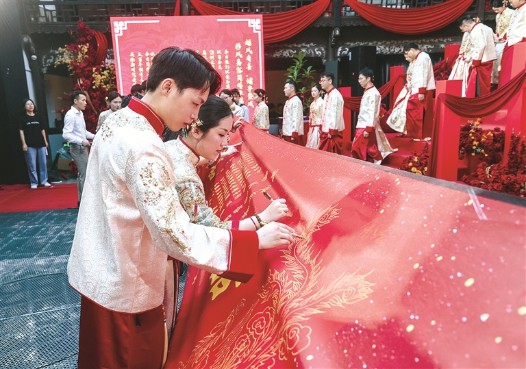 風(fēng)成于上、俗化于下。近年來,越來越多新人選擇集體婚禮,倡導(dǎo)文明簡約的婚嫁理念,通過精心設(shè)計的集體婚禮儀式,打造既莊重又溫馨的婚禮體驗,既減輕經(jīng)濟負擔(dān)、又傳承美好家風(fēng),倡導(dǎo)婚俗改革文明新風(fēng)尚。圖為在浙江省諸暨市西施故里景區(qū)內(nèi),參加集體婚禮儀式的新人們簽訂移風(fēng)易俗簡婚承諾。新華社記者 徐昱 攝