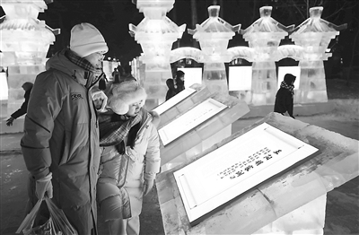 黑龍江省哈爾濱市依托冰雪文化資源創(chuàng)建廉潔品牌,打造含有清廉元素的冰雪景觀園,讓市民游客在賞冰樂雪的同時(shí)受到廉潔文化的浸潤。圖為市民在冰雪景觀前駐足。 劉萌 攝