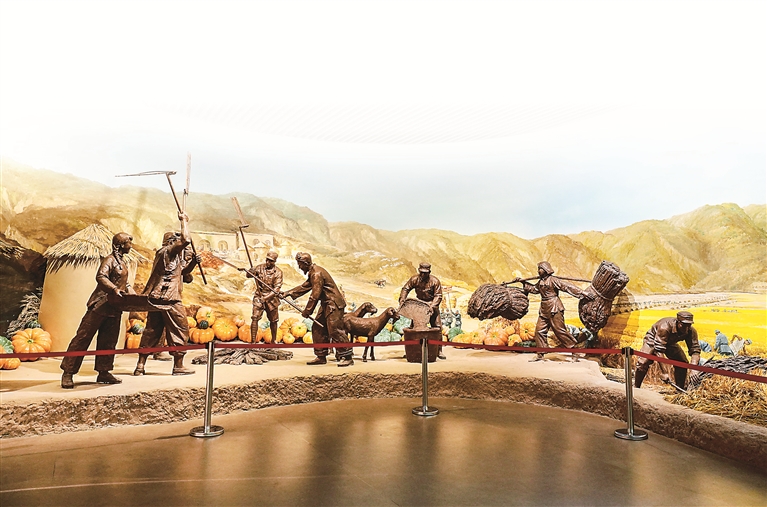 南泥灣大生產(chǎn)紀念館內(nèi)的雕塑作品。中國共產(chǎn)黨領(lǐng)導抗日軍民自力更生、艱苦奮斗,把南泥灣變成“陜北的好江南”。新華社記者 樊雨晴 攝