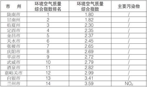 9月份,全省14個城市環(huán)境空氣質(zhì)量綜合排名由好到差分別為:隴南、甘南、臨夏、定西、金昌、天水、張掖、慶陽、平?jīng)?、武威、酒泉、嘉峪關、白銀、蘭州。