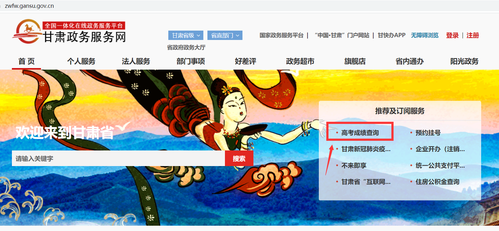 打開“甘肅政務(wù)服務(wù)網(wǎng)”https://zwfw.gansu.gov.cn/,在首頁“推薦及訂閱服務(wù)”欄目,點(diǎn)擊“高考成績查詢”進(jìn)入查詢頁面,輸入考生號、身份證號即可查詢。