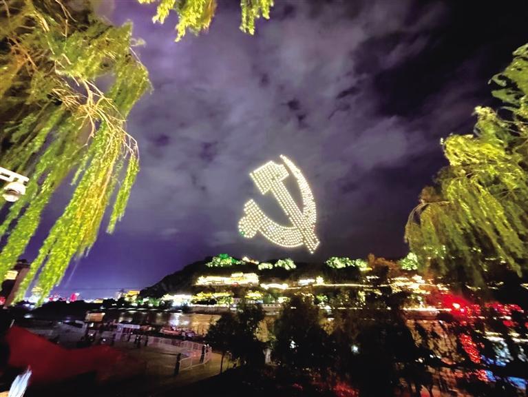 今夜的蘭州經(jīng)過雨水的沖洗格外清爽嫵媚,在現(xiàn)場(chǎng),600架無人機(jī)翱翔天空,照亮璀璨的蘭州之夜,無人機(jī)在遙控下變換著各種隊(duì)形和字樣,表達(dá)對(duì)黨的生日祝福。
