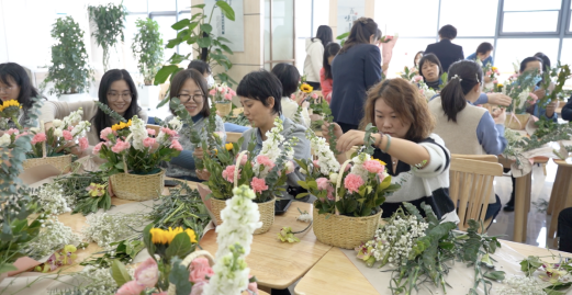繁花似錦報春來,天姿國色抒情懷。活動現(xiàn)場花香四溢、芬芳溫馨,充滿著春天般的氣息,大家手捧鮮花,在花藝老師的講解下,開始學(xué)習(xí)各種鮮花所蘊含的花語祝福和選花、裁剪、搭配、造型及養(yǎng)護等藝術(shù)插花技巧。隨后,女工們將原本普普通通的月季、康乃馨、蝴蝶蘭、滿天星、向日葵等多種花材修剪整枝,根據(jù)不同的色彩和形狀有層次地搭配在一起。通過精心構(gòu)思造型、發(fā)揮創(chuàng)意想象,有的注重意境創(chuàng)設(shè)追求,有的突出枝情花韻之趣,有的抒展自然樸實風(fēng)格……在細致地修飾和精心地創(chuàng)作下,一枝花、一棵草都變得詩情畫意和清新怡人,節(jié)日的喜慶氣氛瞬間升騰。